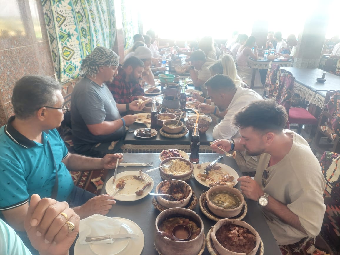 Hurghada’dan özel Luksor Özel Günlük Turu. Mulukhiyah, kızarmış et ve tavuk gibi geleneksel Güney Mısır mutfağının ve Mısır Güneş Ekmeği’nin (Şemsi Ekmeği, Eiş Şemsi, Güneşte Pişirilmiş Ekmek) tadını, çiftliklerin ve çevredeki tarlaların güzelliği arasında çıkarın. Hazır büfe yemeklerinden çok uzakta, gerçek antik Mısır lezzetlerinin tadını çıkarın.